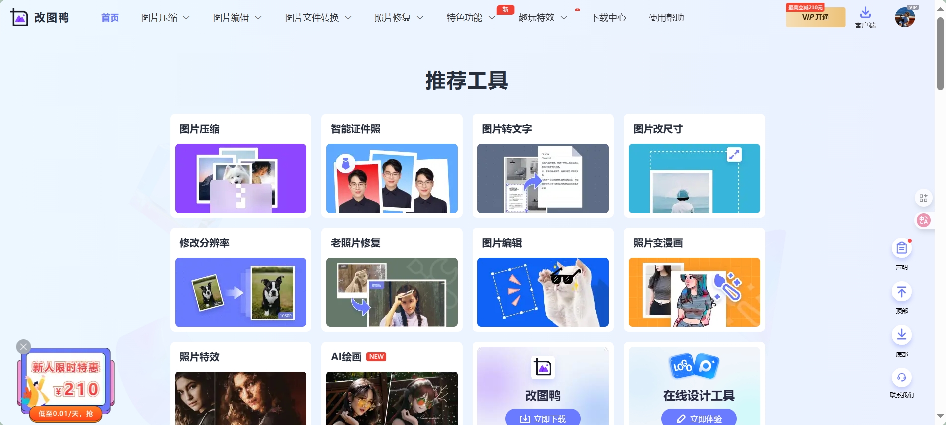 改图鸭定位为 “一站式在线图片处理专家”,主要服务于有日常图片处理需求的个人用户、职场人士及小型团队。其核心价值在于打破传统图片处理软件的安装门槛,通过网页端提供轻量化、多功能的图像编辑服务,帮助用户快速解决图片处理问题,节省时间与设备资源。