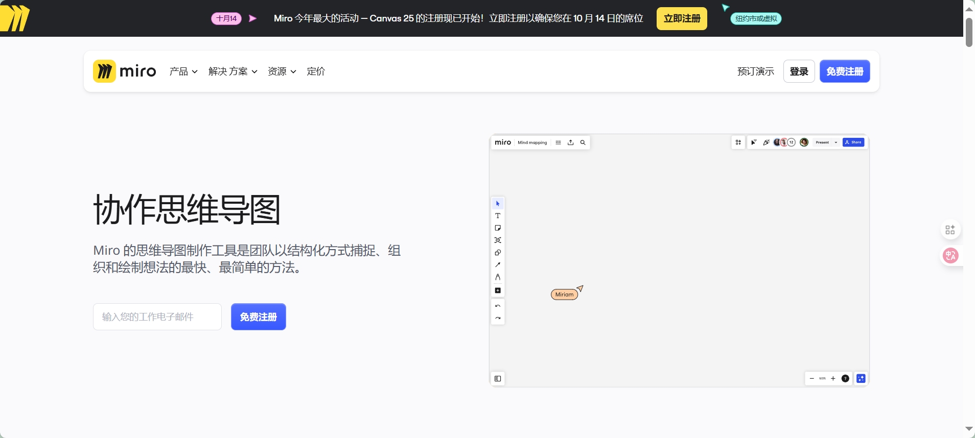Miro 思维导图工具是一款聚焦团队协作的可视化思维平台,核心功能是帮助团队快速捕捉、组织与呈现 ideas,通过思维导图形式结构化思想。其特点是集成 AI 辅助(Miro Assist)、实时协作与无限画布,适配 brainstorm、问题分析、项目规划等场景,被 Accenture、PEPSICO 等众多企业采用,支持免费使用。