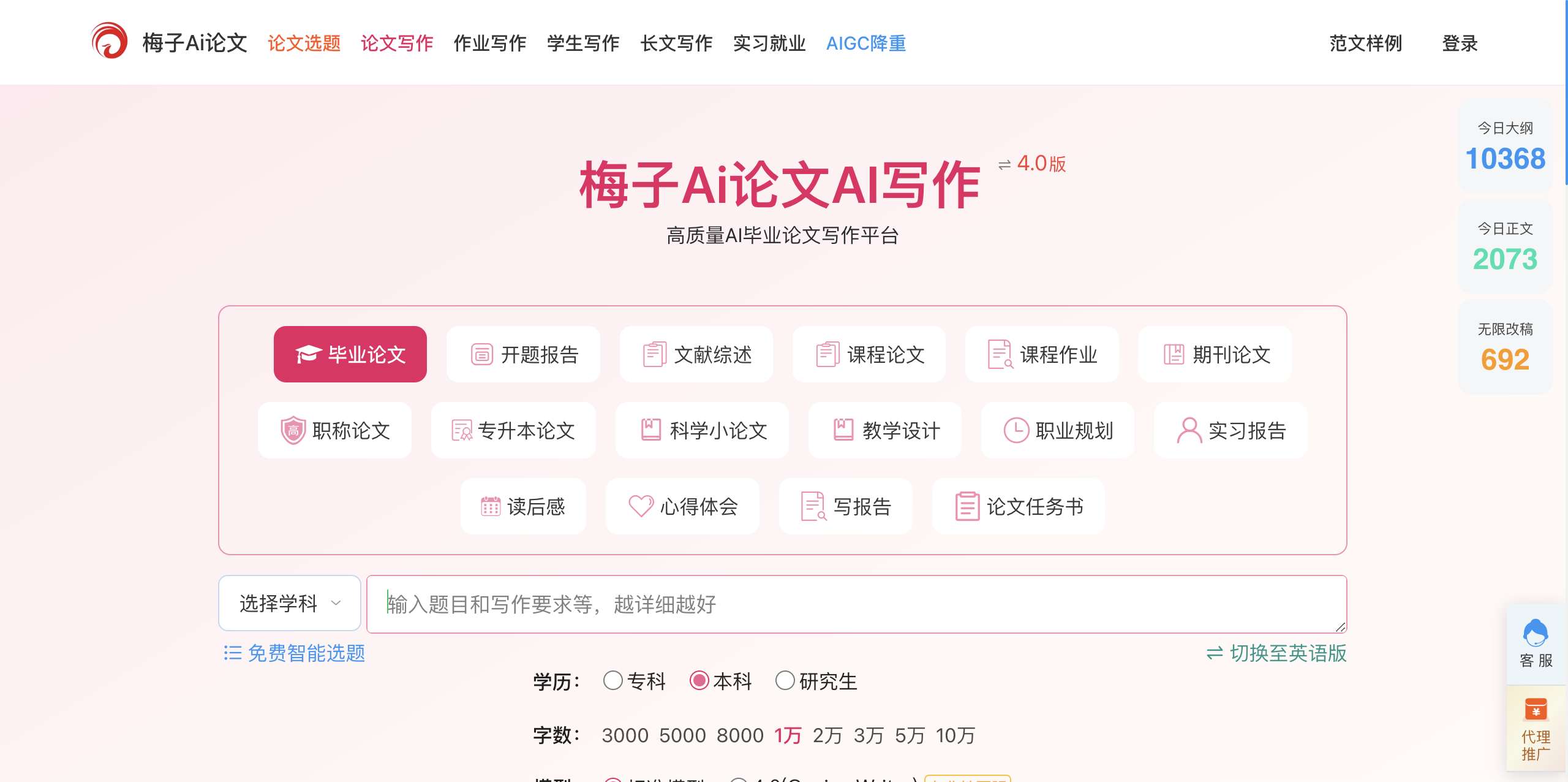 梅子AI学术论文撰写系统是第四代升级产品,旨在为各类教育背景的学生提供优质的人工智能毕业论文创作服务。无论您处于哪个学习阶段或需要完成多少字数的作业,都能在此找到适合的选择,并且平台还提供了丰富的语言选项与多种模型供用户挑选。此外,它还配备了多项实用功能和保障措施来支持您的学术研究工作。