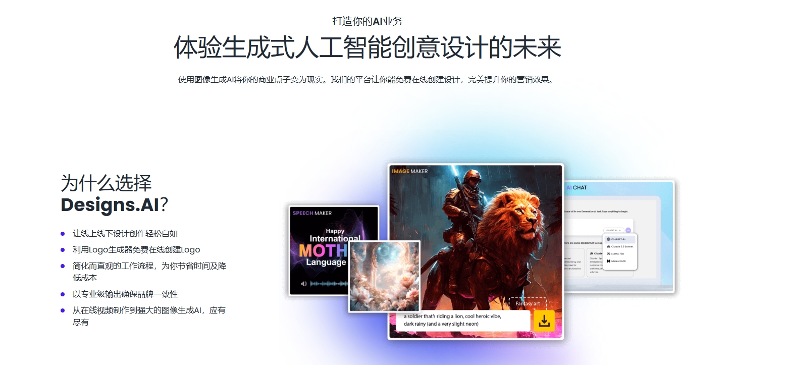 Designs.AI 是一套聚焦 “全链路 AI 创意生产” 的工具套件,核心定位是 “让所有用户都能轻松做出专业级设计”—— 不管你是要给初创公司做 LOGO、给社交媒体发海报,还是给产品宣传剪视频、配旁白,打开它就能一站式搞定,不用再切换多个设计、剪辑、文案工具。