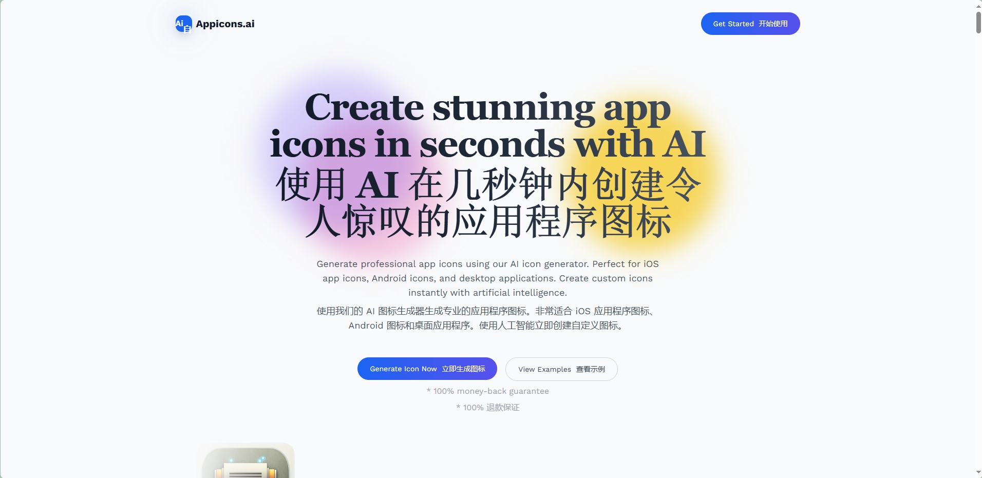 Appicons.ai 是 AI 驱动的应用图标生成平台,专注于快速制作 iOS、Android 及桌面端专业图标,输入描述即可生成,还支持 GPT 优化提示与在线编辑,提供 100% 退款保障,获全球开发者认可。