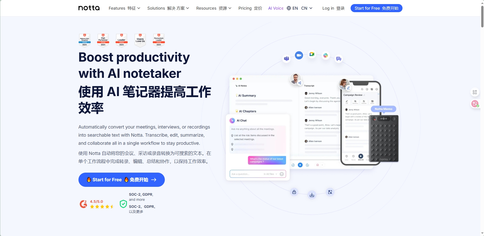 Notta.ai 是 AI 驱动的会议记录与转录工具,可将会议、访谈、录音实时转为可搜索文本,支持转录、编辑、总结、协作一体化,适配多场景,获 2024 Spring “领导者”“高绩效者” 等行业奖项,哈佛、耐克等机构均在使用。