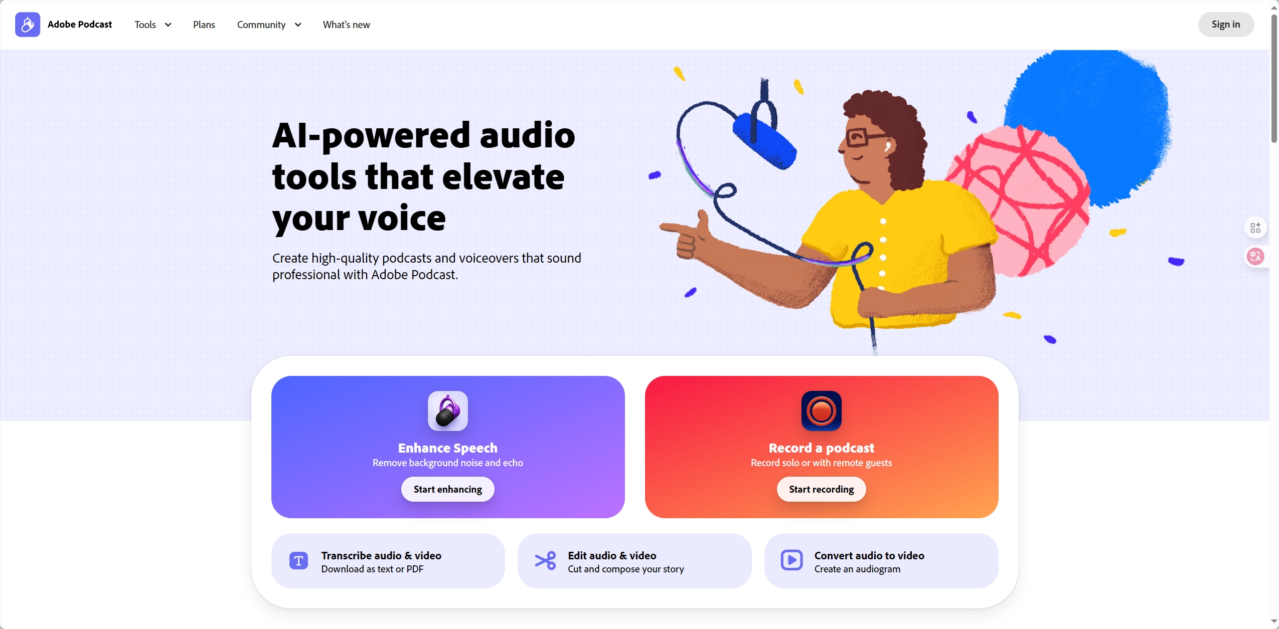 网页端 AI 播客制作与音频处理平台,核心定位是 “打破播客创作的设备与技术门槛”—— 无论是播客新手用普通麦克风录音,还是专业创作者远程邀请嘉宾录制,或是需要快速处理讲座、音频 newsletter 等内容,都能通过其 AI 驱动的工具实现 “专业级音频效果”。平台无需下载软件,浏览器直接使用,整合 “录音、降噪、转录、剪辑、音频转视频” 全功能,支持单日 4 小时音频处理、1GB 大文件上传,适配个人播客、教育讲座、品牌音频内容等多场景,是 Adobe 生态下 “轻量化音频创作” 的核心解决方案。