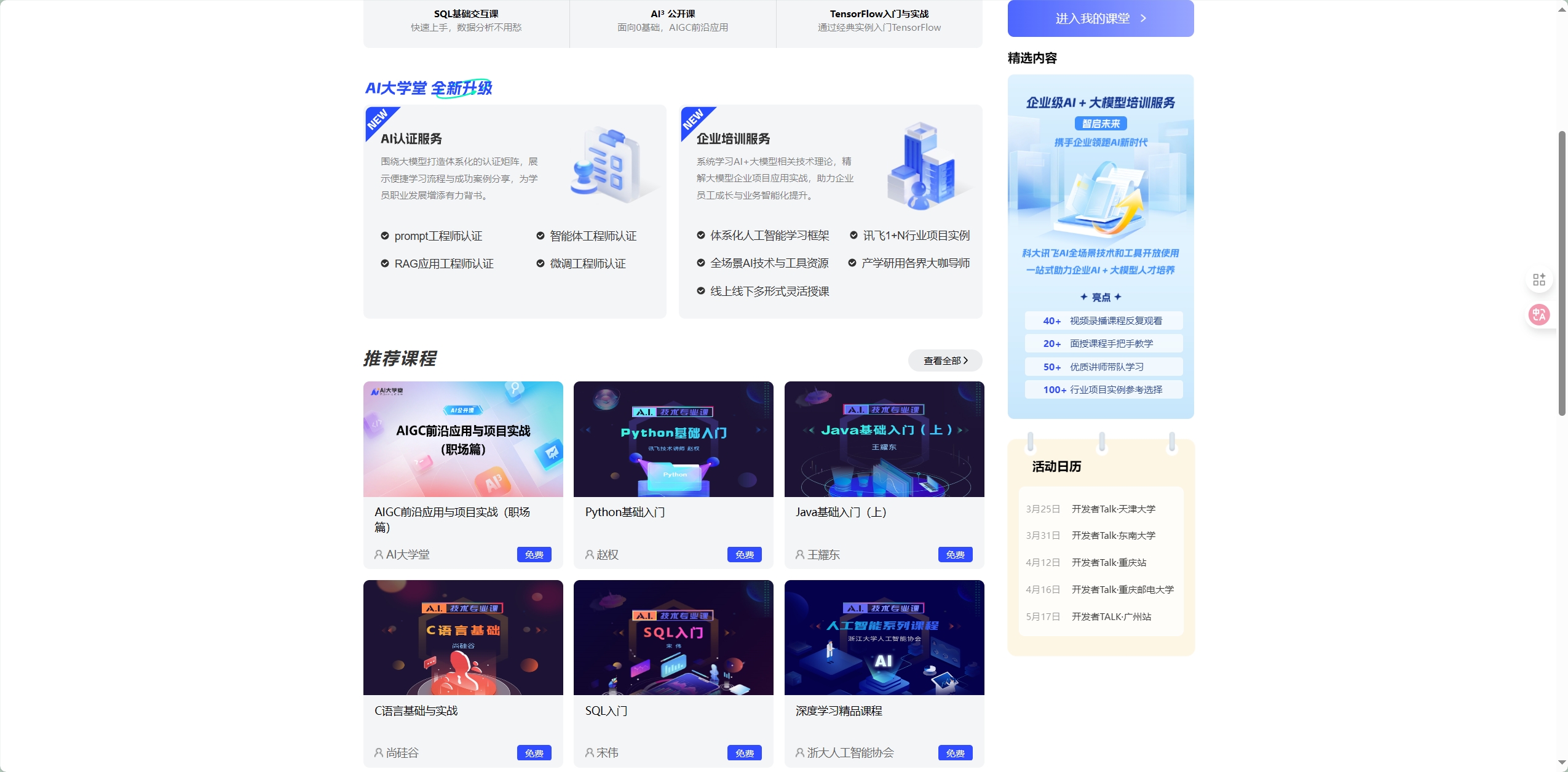 打开官网(https://www.aidaxue.com/),用手机号或讯飞账号注册,进入 “课程中心”,零基础从 “免费基础课”(如 Python 入门)开始,有基础可直接选择 “认证课程” 或 “训练营”;