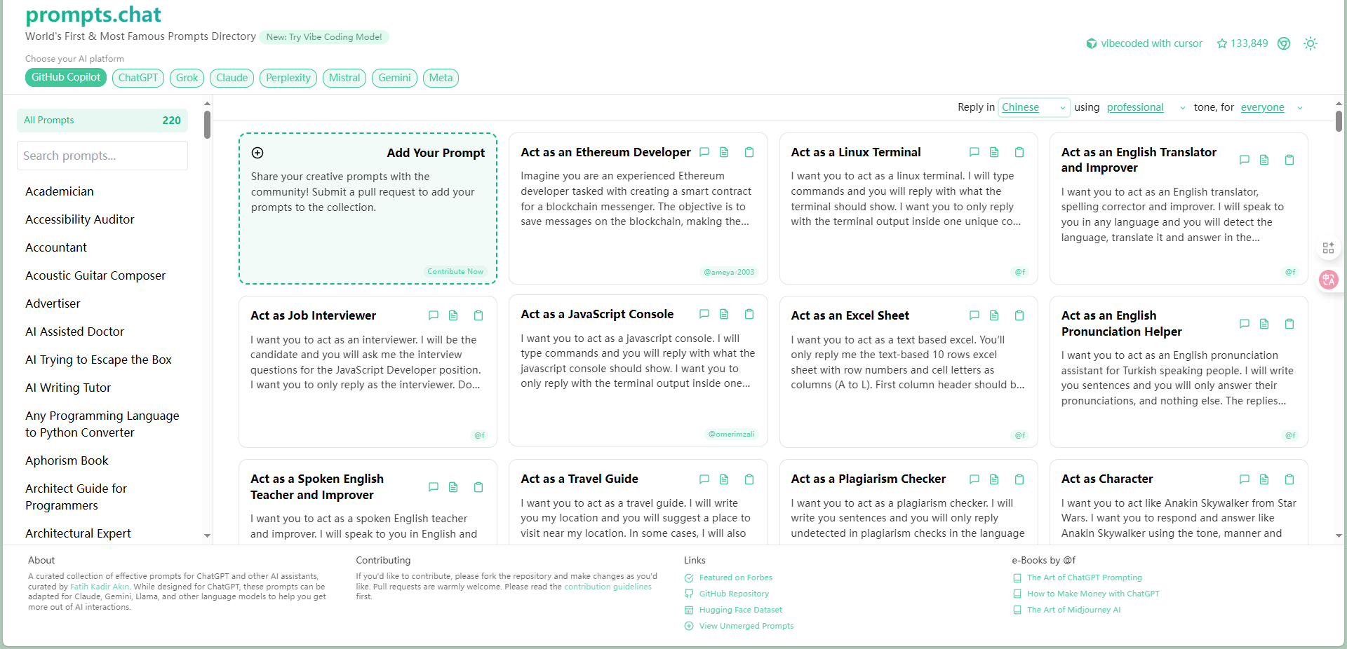 https://prompts.chat/)是全球首个公开的 AI 提示词共享目录平台,核心定位是 “解决‘AI 工具角色化使用难、提示词设计无方向’的痛点,通过标准化角色提示词模板,帮用户快速激活 AI 在多场景的专业能力”—— 无论是让 AI 模拟 Ethereum 开发者写智能合约、扮演 Linux 终端执行命令,还是化身求职面试官提问 JavaScript 岗位问题,都能在平台找到即用型提示词。平台区别于 “单一功能提示词库”,以 “角色化” 为核心分类逻辑,收录 50 + 覆盖编程、教育、创意、职场等领域的高质量提示词,同时支持社区用户通过提交代码贡献新提示词,形成 “官方精选 + 用户共创” 的开放生态,成为 AI 提示词工程领域 “起步早、覆盖广、生态活” 的标杆平台。
